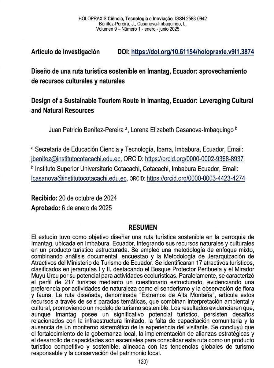 Abstract The study aimed to design a sustainable tourist route in the parish of Imantag, located in Imbabura, Ecuador, integrating its natural and cultural resources into a structured tourism product....